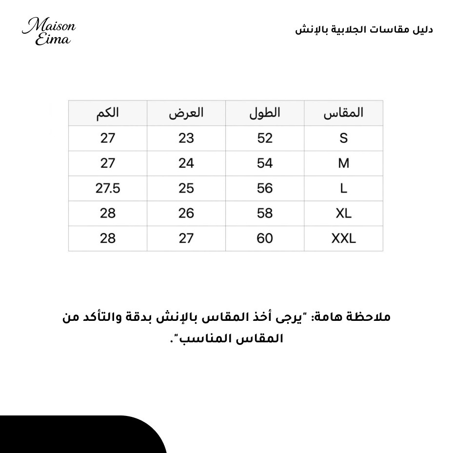 يتميز التصميم بقصة انسيابية واسعة تمنح إحساسًا بالراحة والرقي في آنٍ واحد، بينما تضيف النقوش الزخرفية الراقية لمسة فنية مستوحاة من أمواج البحر وأشعة الشمس. القماش الخفيف المتدفق يمنح الجلابية حضورًا مميزًا أثناء الحركة، لتبدو الإطلالة وكأنها لوحة من الضوء واللون.